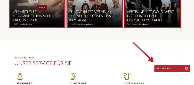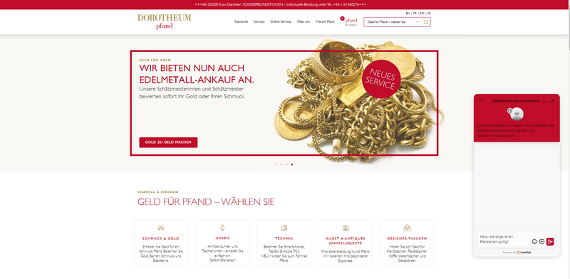 Der Live Chat funktioniert ganz einfach. Alles, was du tun musst, ist die DOROTHEUM Pfand Website zu besuchen und deine Fragen und Anliegen im Chatfenster mit uns zu teilen. Eine Registrierung ist nicht notwendig. Außerhalb der Sprechstunde kannst du uns gerne eine Nachricht im Chatfenster hinterlassen. Wir beantworten deine Fragen dann zeitnah per E-Mail.