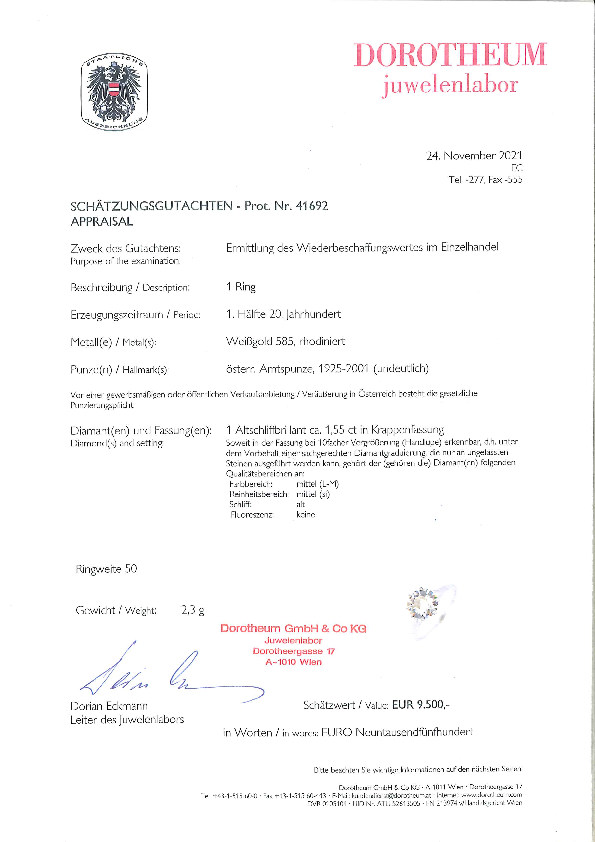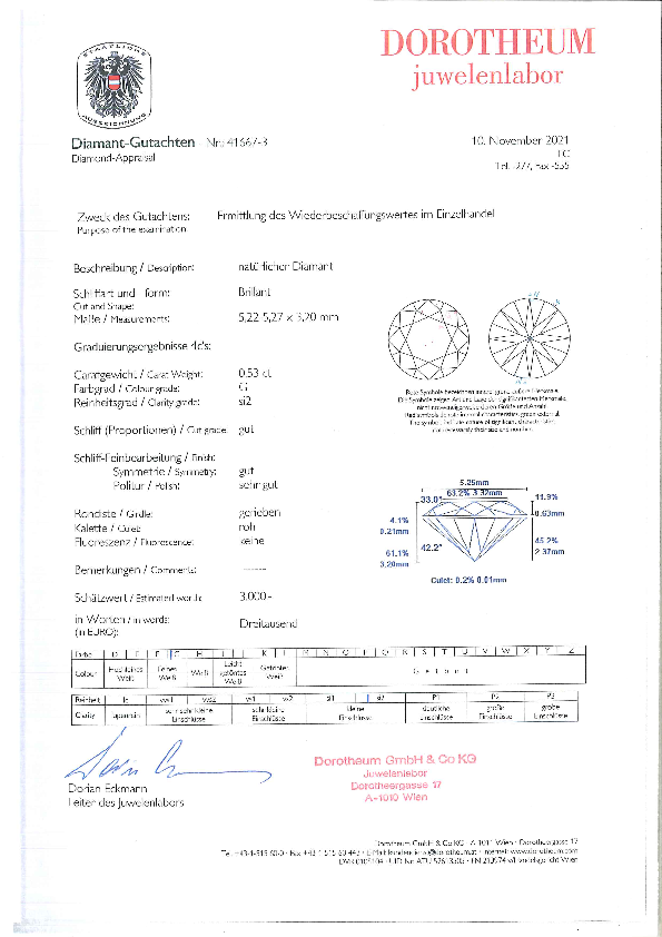 Im Internet schwirrt eine Vielzahl von Zertifikaten herum, die teilweise wichtige Informationen nicht enthalten oder einfach fehlerhaft sind. Da sie für einen Laien meist nicht zu durchschauen sind, empfehle ich dir die Rücksprache mit einem Experten oder einer Expertin. Verlässliche AnsprechpartnerInnen sind der Juwelier deines Vertrauens oder die KollegInnen im Dorotheum Juwelenlabor. Wichtig ist, der Experte bzw. die Expertin sollte GemmologIn und DiamantgutachterIn sein.